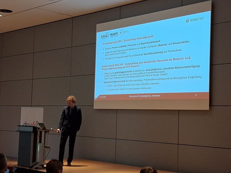 On November 4, Johannes Zawatzki gave a presentation on the topic “Monitoring the 3D Printing Process (FFF) Using Ultrasound”. He demonstrated how ultrasound can be applied as a non-destructive testing method for process monitoring and quality assurance in additive manufacturing. The strong interest and subsequent discussions underscored the technical relevance of this approach.